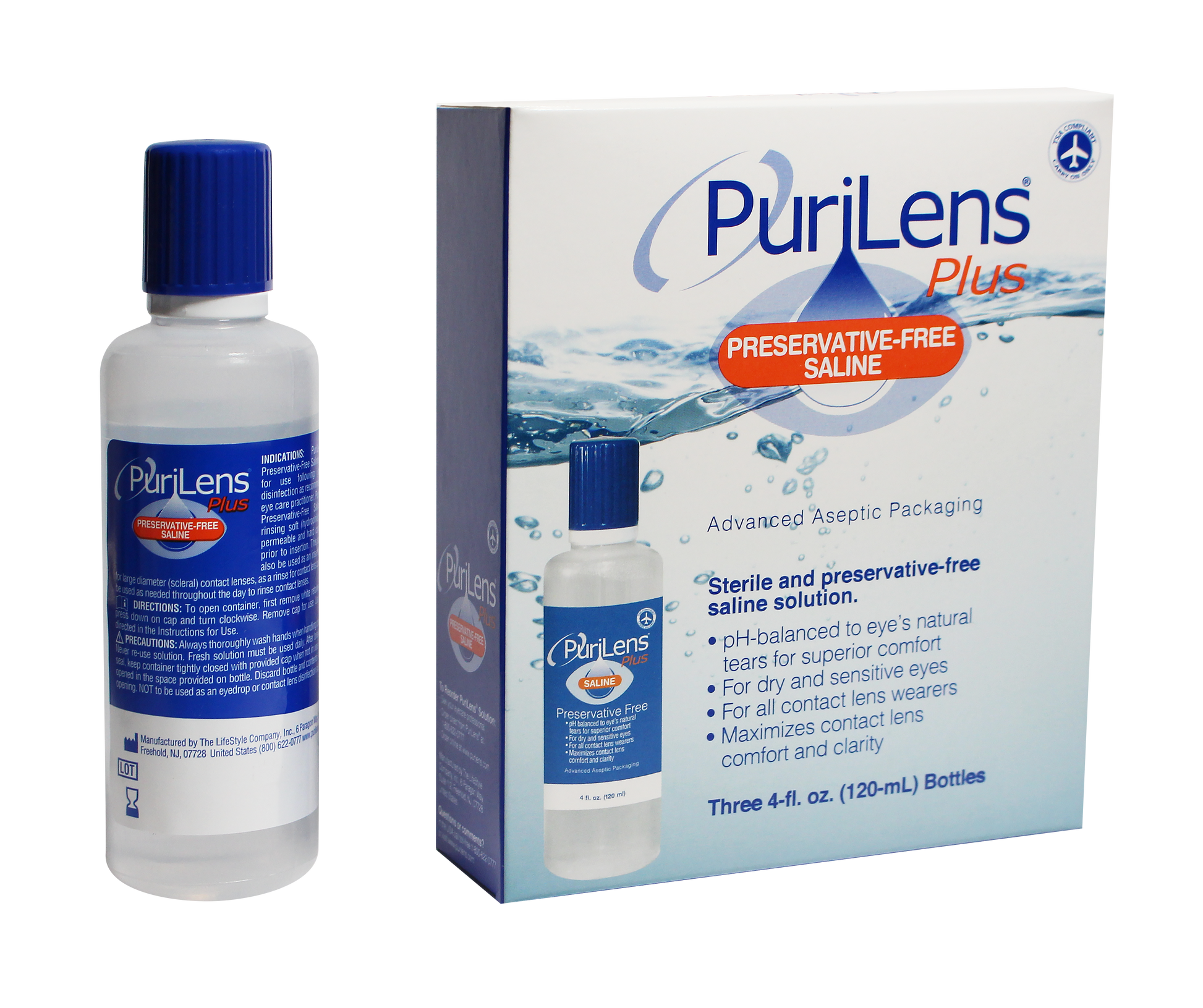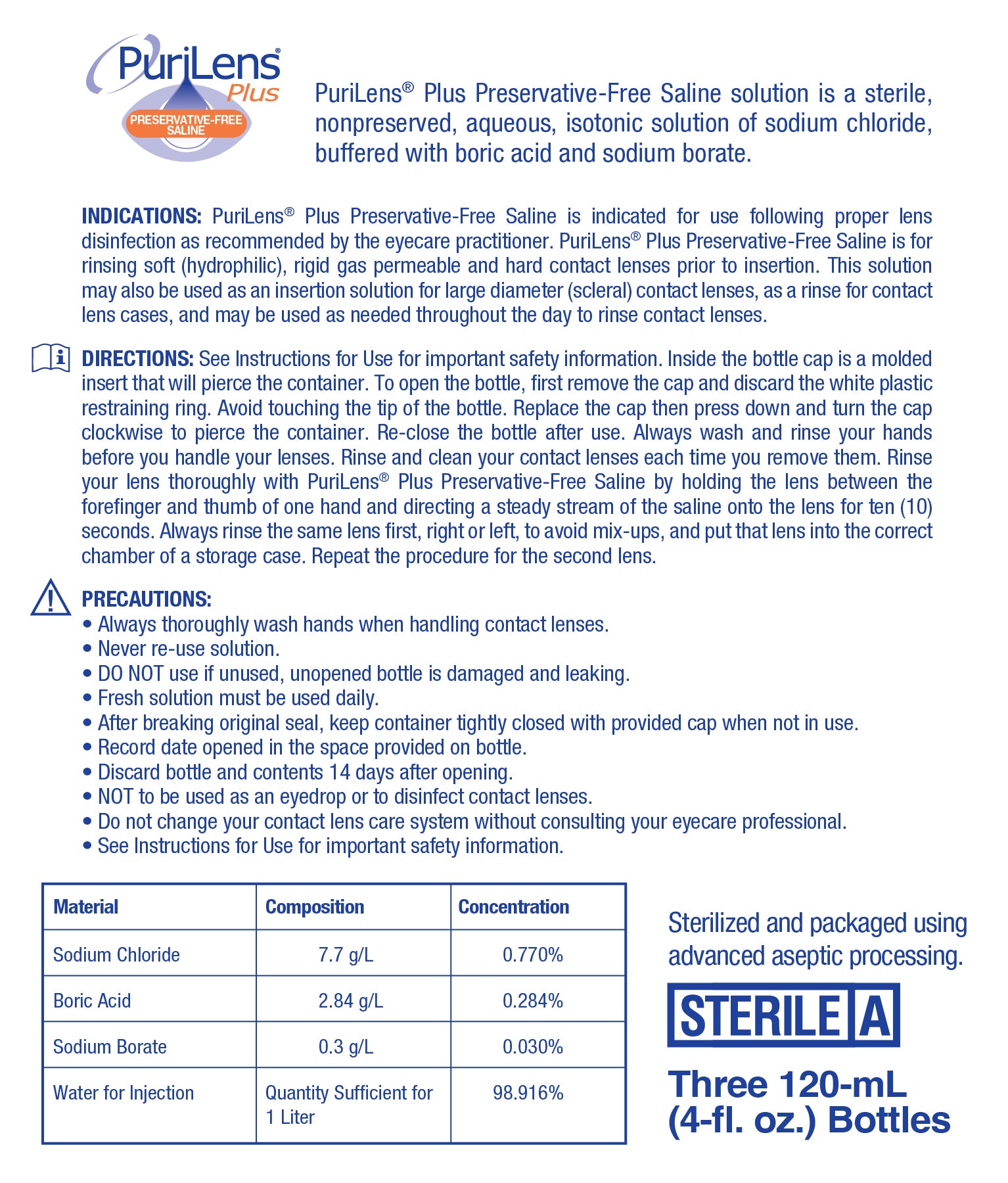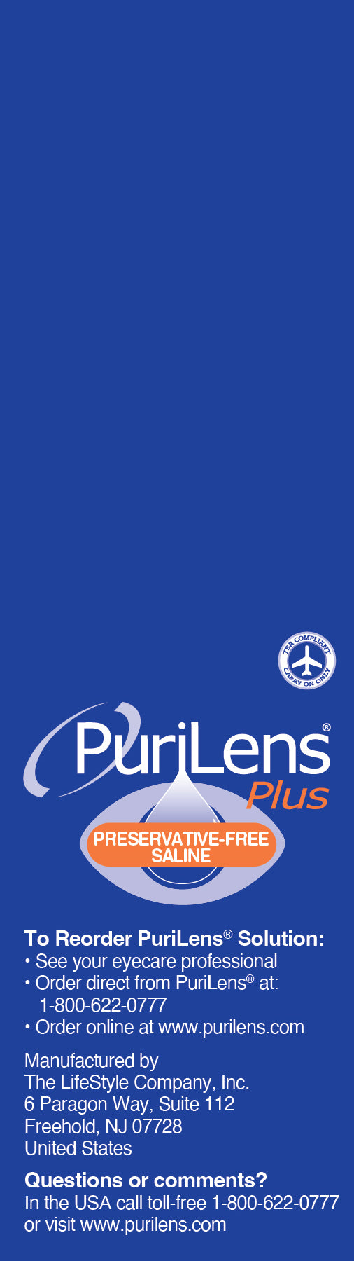 PuriLens Plus Preservative-Free Saline is a sterile, non-preserved, aqueous, isotonic solution of sodium chloride, buffered with boric acid and sodium borate, and used for rinsing and storing contact lenses. PuriLens Plus Preservative-Free Saline is sterilized and packaged using aseptic processing (blow-fill-seal). PuriLens Plus Preservative-Free Saline is manufactured in the United States by The Lifestyle Company, Inc.