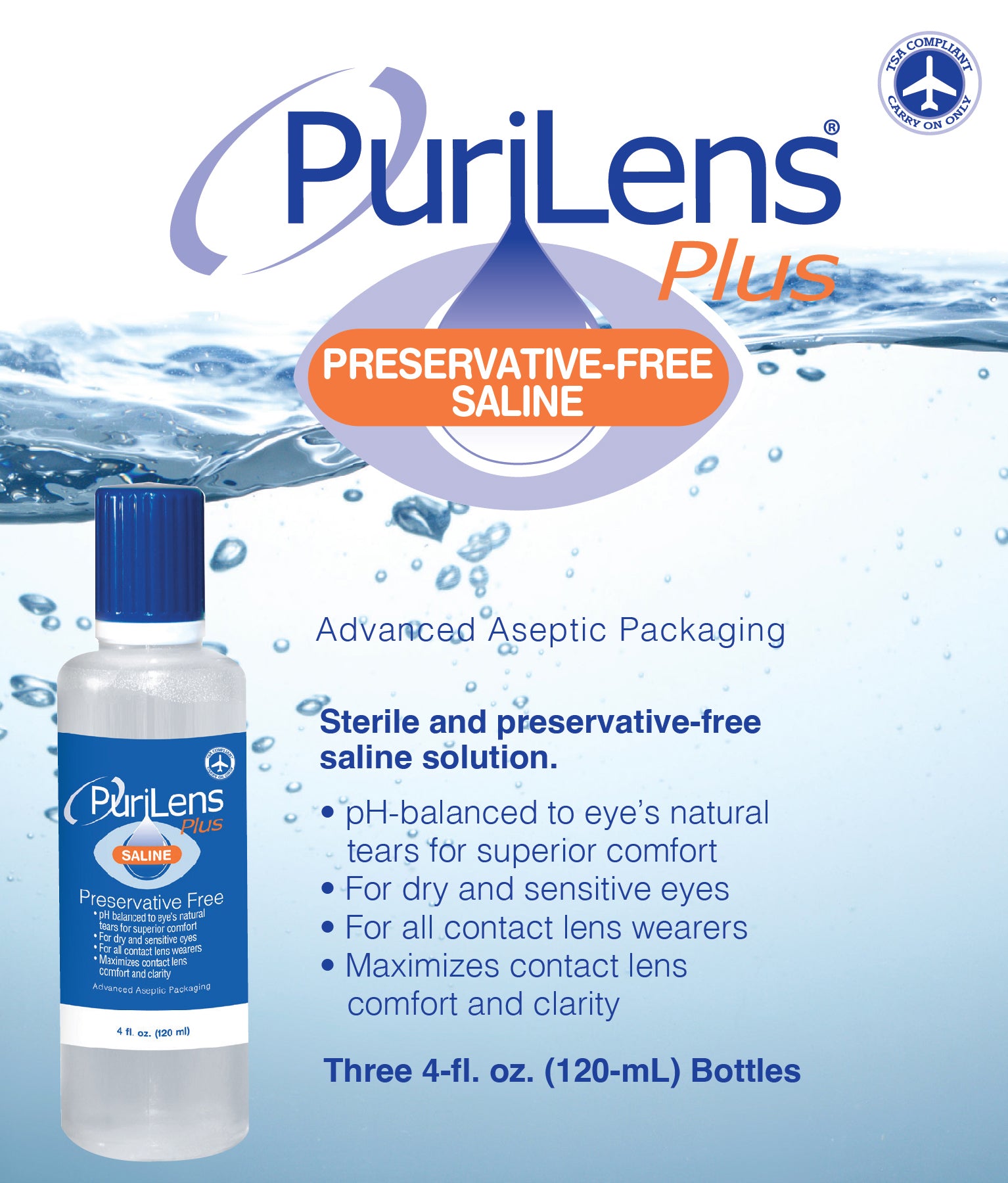 PuriLens Plus Preservative-Free Saline is indicated for use following proper lens disinfection as recommended by the eye care practitioner. PuriLens Plus Preservative-Free Saline is for rinsing soft (hydrophilic), rigid gas permeable and hard contact lenses prior to lens insertion. This solution may also be used as an insertion solution for large diameter (scleral) contact lenses, as a rinse for contact lens cases, and may be used as needed throughout the day to rinse contact lenses.
