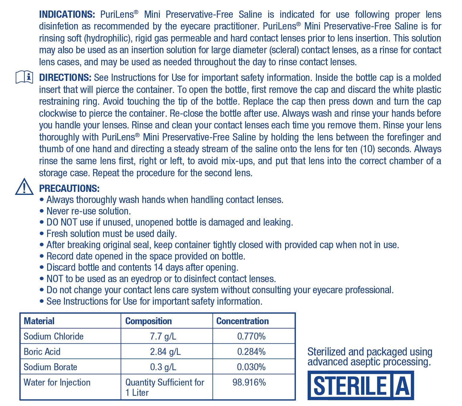 PuriLens Mini Preservative-Free Saline is indicated for use following proper lens disinfection as recommended by the eye care practitioner. PuriLens Mini Preservative-Free Saline is for rinsing soft (hydrophilic), rigid gas permeable and hard contact lenses prior to lens insertion. This solution may also be used as an insertion solution for large diameter (scleral) contact lenses, as a rinse for contact lens cases, and may be used as needed throughout the day to rinse contact lenses.